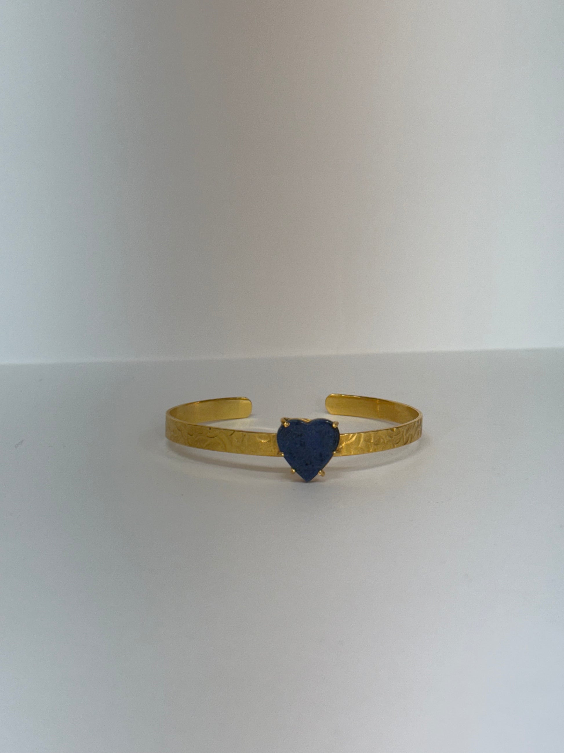 Le bracelet “Cœur Céleste” unit la douceur du symbole du cœur à la profondeur d’une pierre bleue naturelle. Monté sur un jonc fin martelé en plaqué or, ce bijou exprime l’amour, la confiance et l’intuition. Une création délicate pour celles qui aiment conjuguer émotion et élégance.