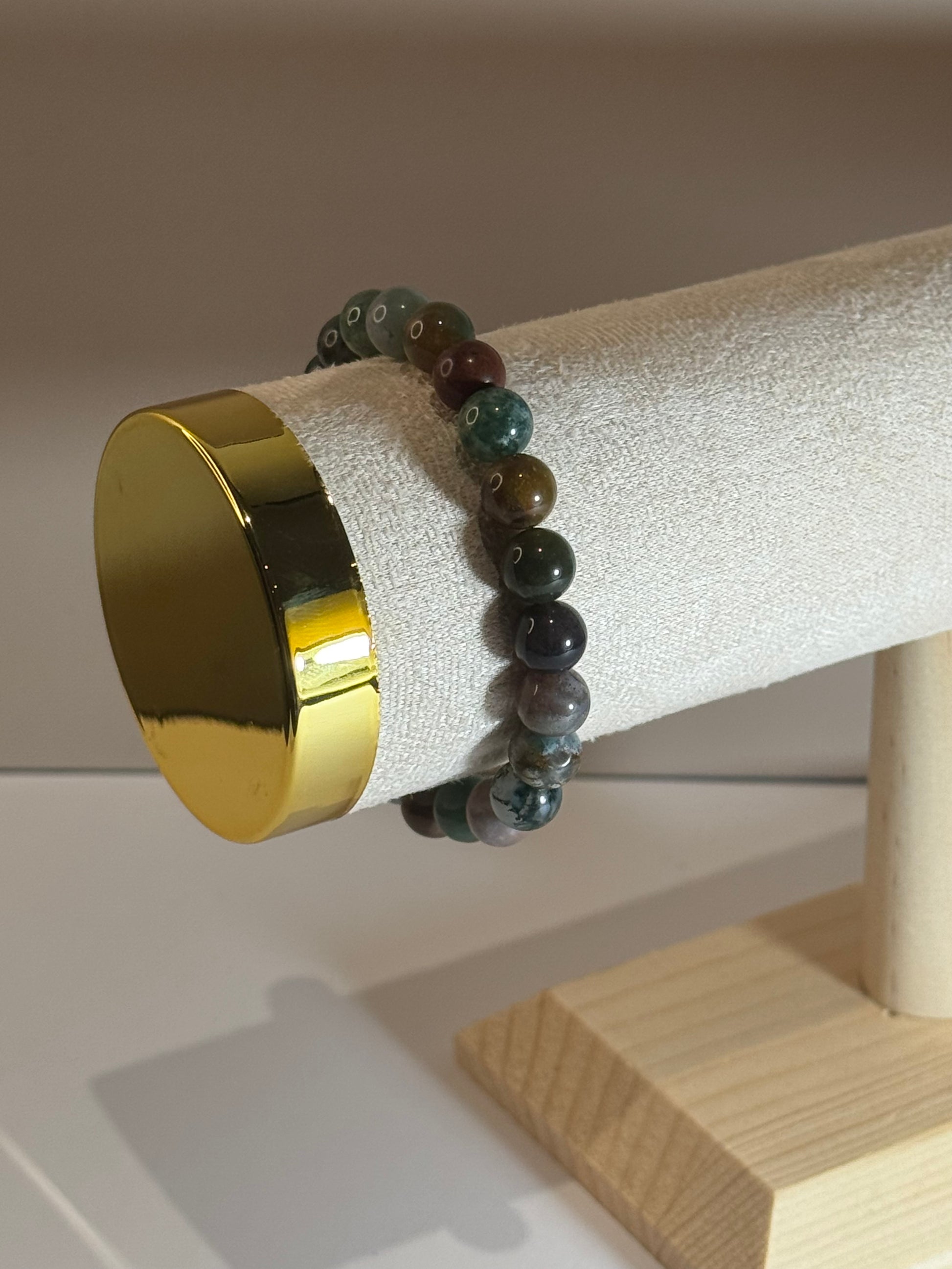 Le bracelet Sérénité d’Agate est composé de véritables pierres d’agate indienne, réputées pour leurs magnifiques teintes naturelles allant du vert mousse au brun terreux. Chaque perle raconte une histoire ancienne, façonnée par le temps. Ce bijou incarne la tranquillité, l’équilibre et la force intérieure.