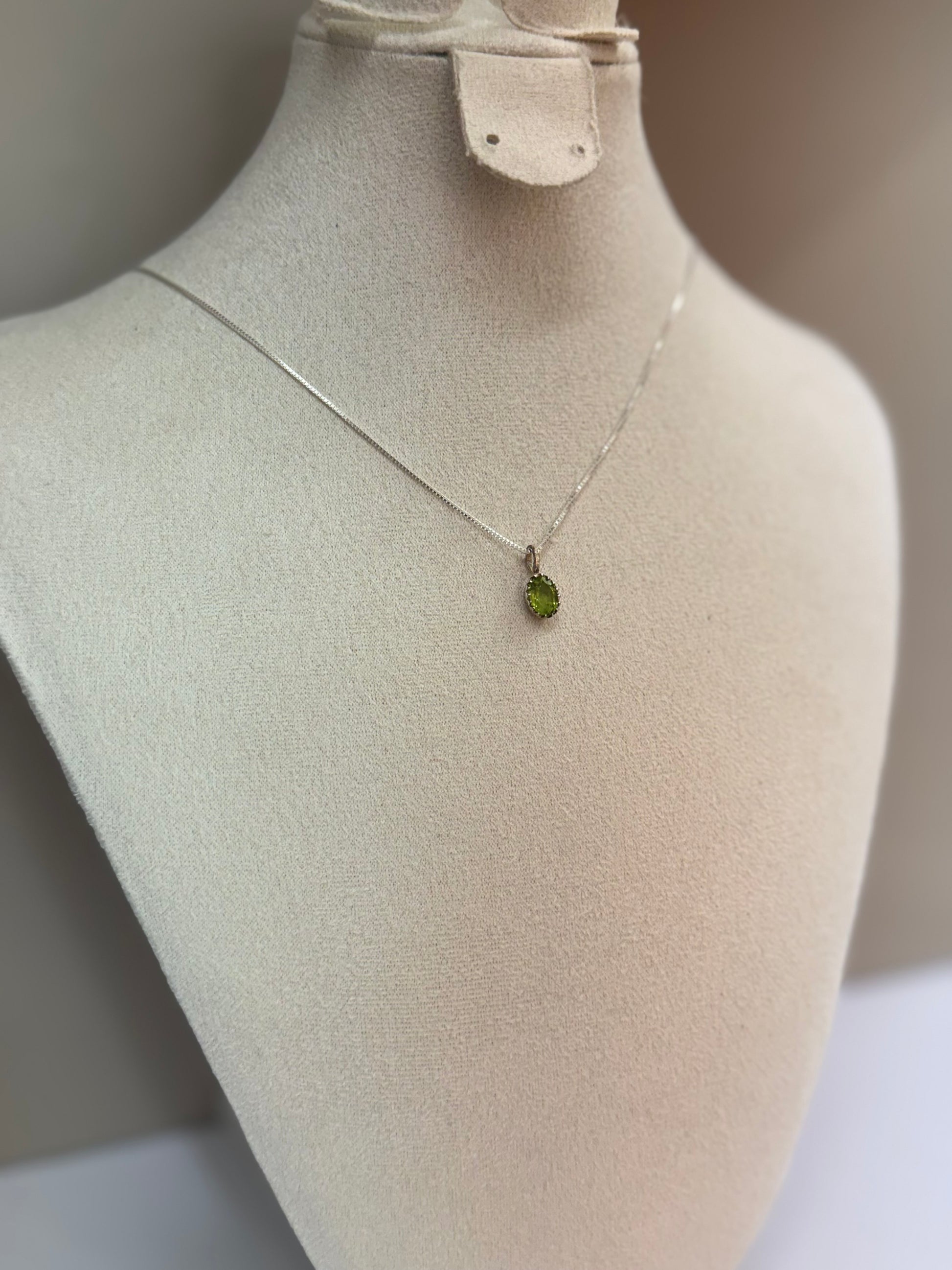 L’éclat vert tendre de la péridot rappelle la fraîcheur des forêts et la lumière d’un matin d’été. Montée sur une chaîne fine en argent 925, cette pierre naturelle illumine le cou avec élégance et douceur.