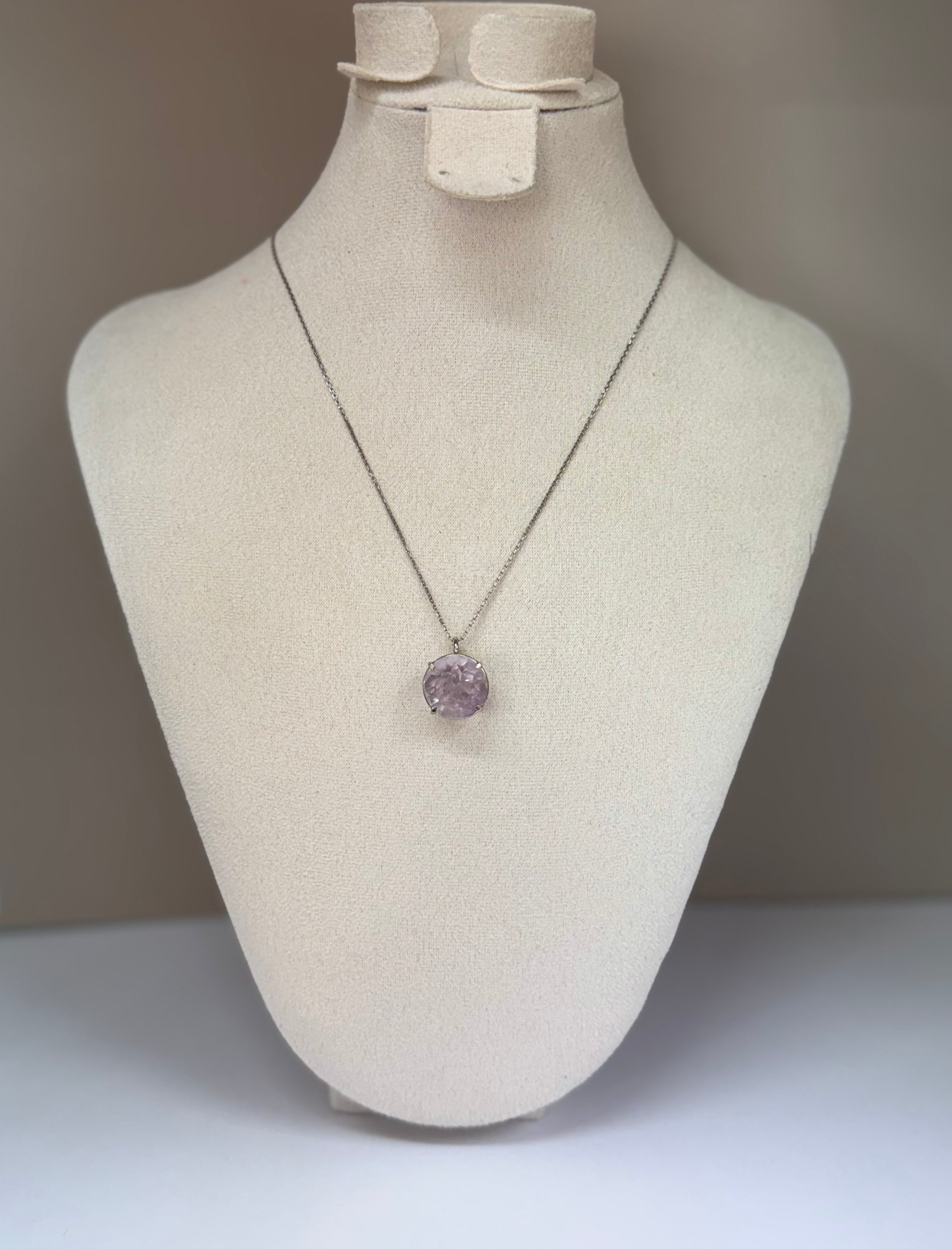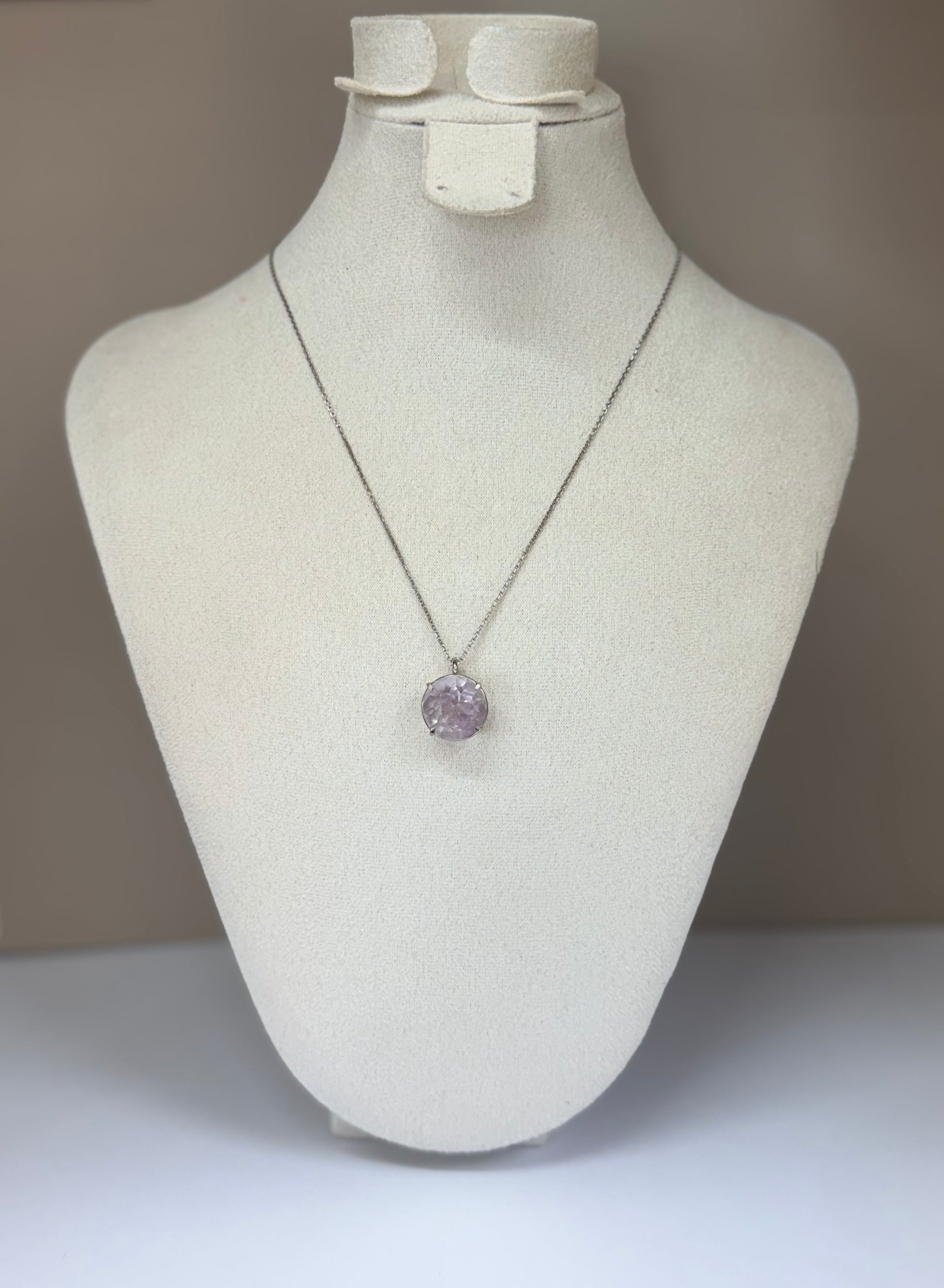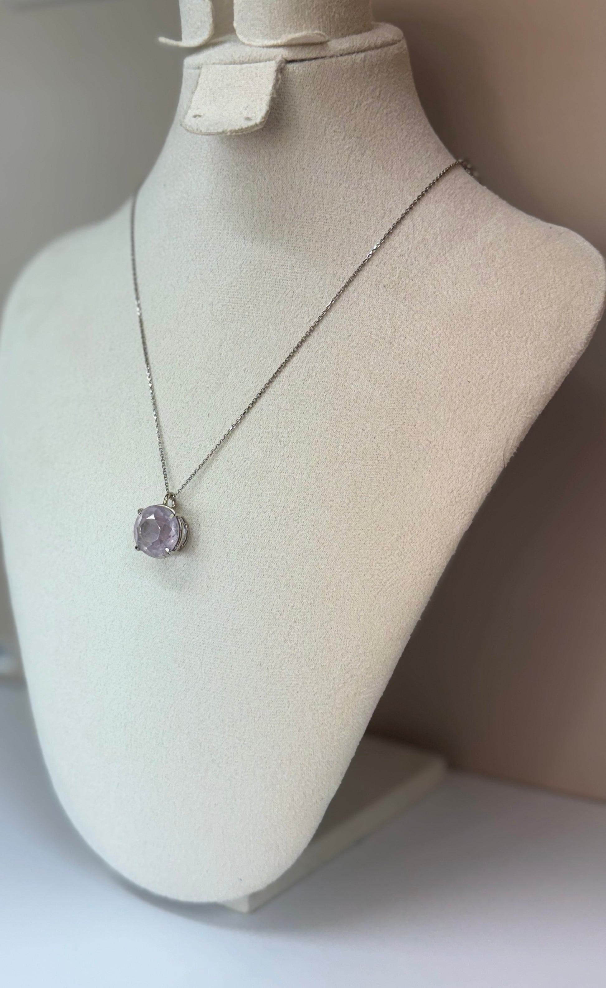Ce collier captivant met en lumière une améthyste naturelle taillée en facettes éclatantes, suspendue à une fine chaîne en argent 925. Avec sa teinte lavande claire, cette pièce dégage une élégance douce et subtile, idéale pour sublimer toutes vos tenues avec finesse.