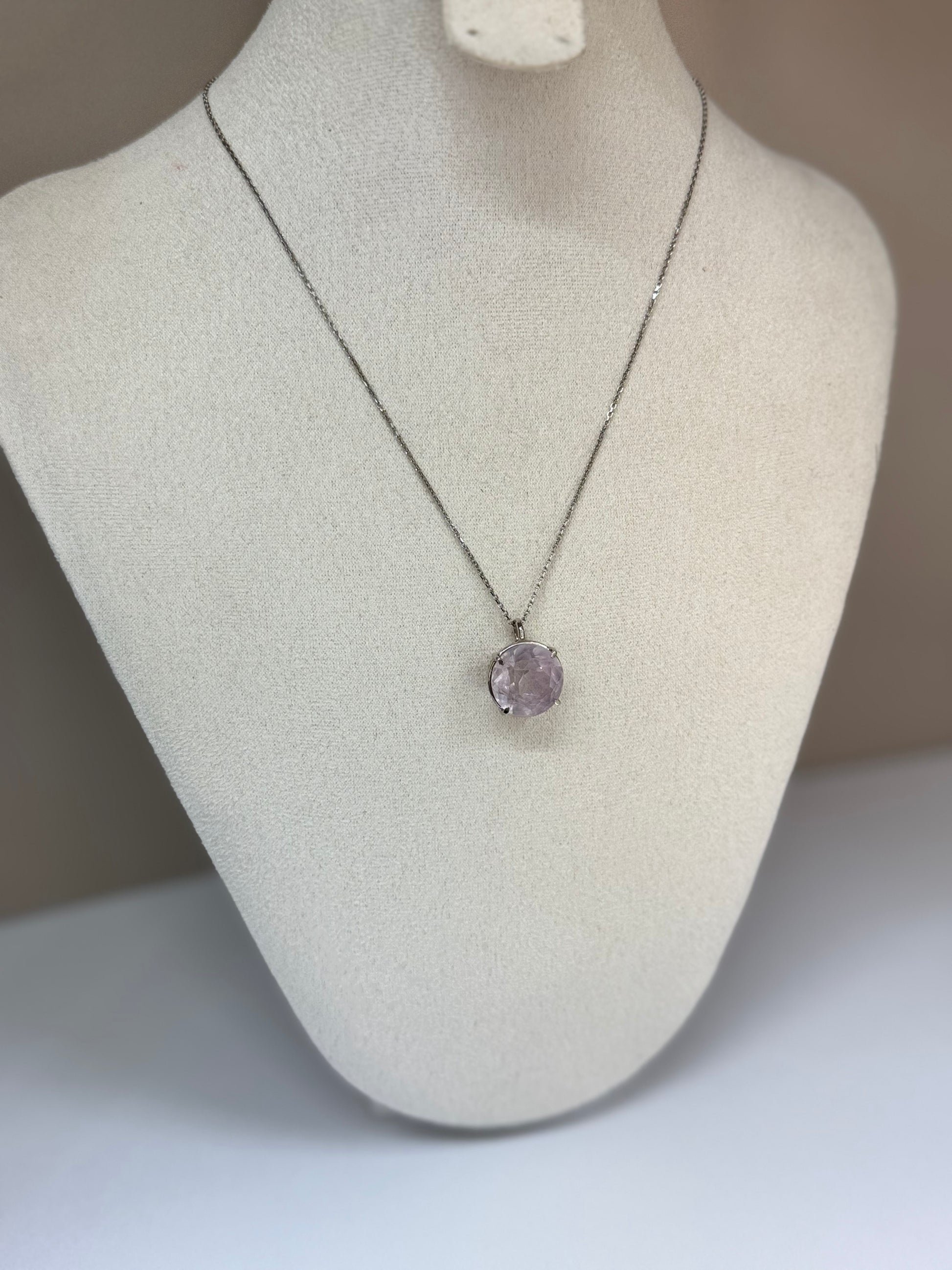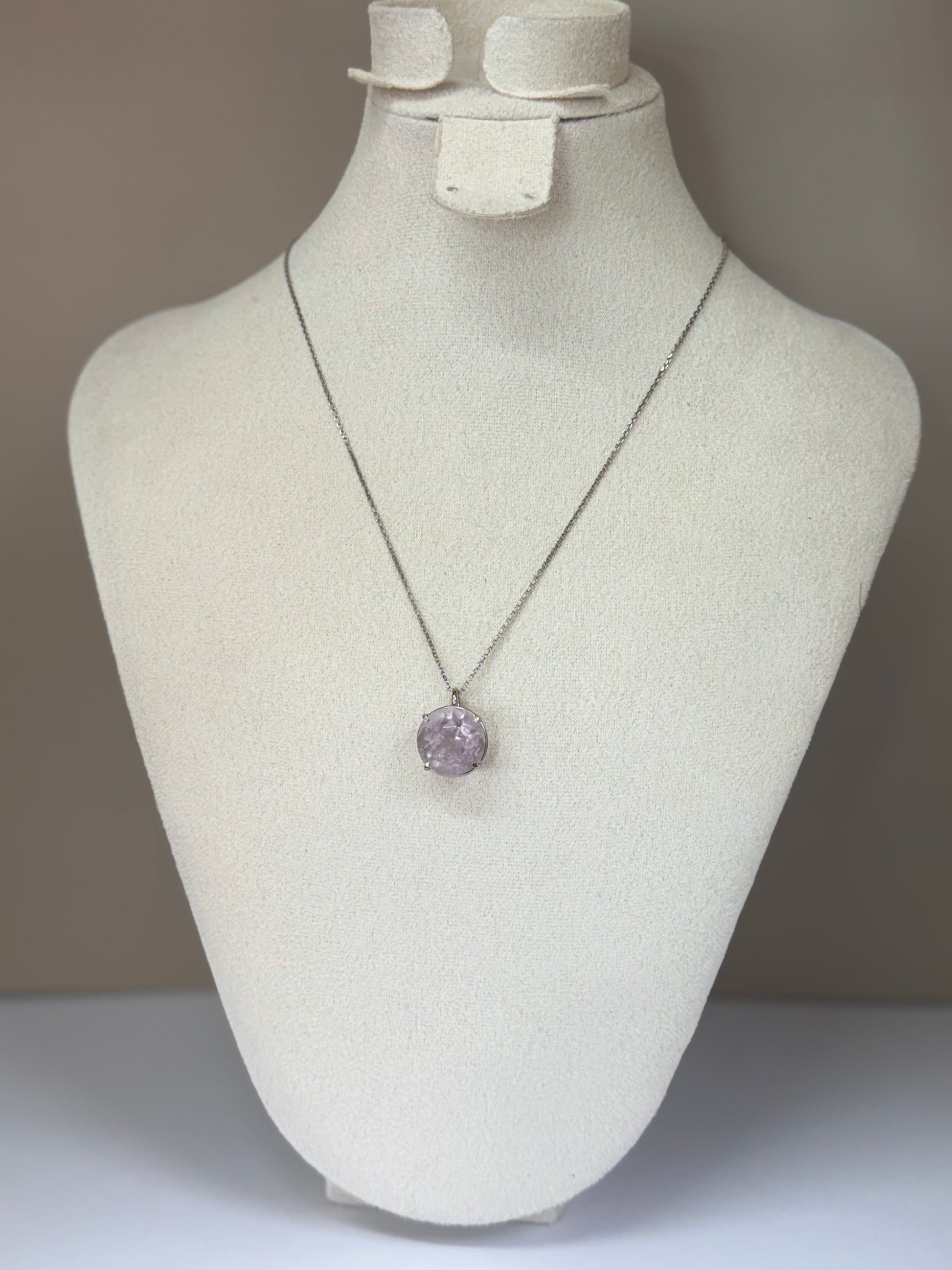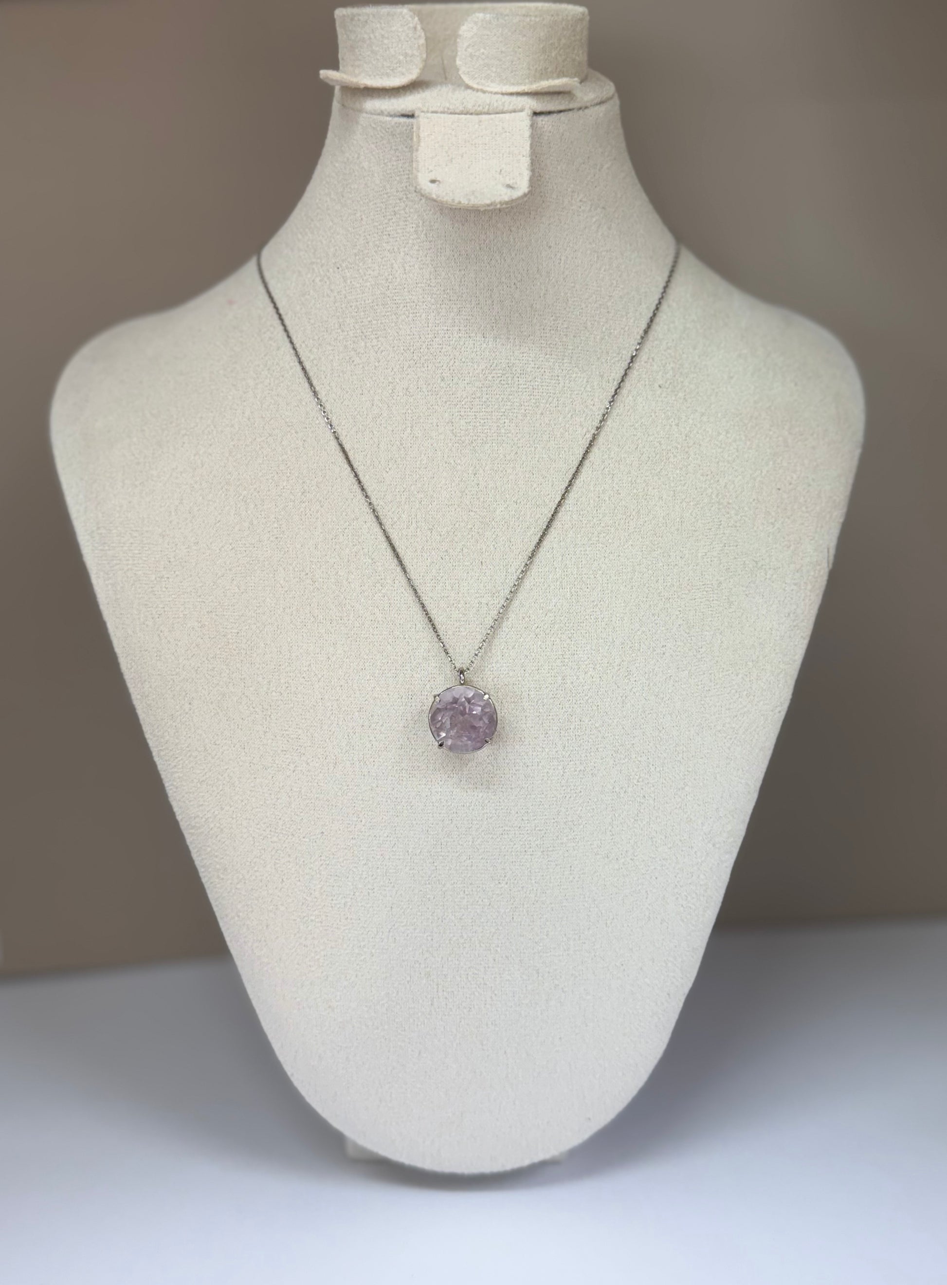 Ce collier captivant met en lumière une améthyste naturelle taillée en facettes éclatantes, suspendue à une fine chaîne en argent 925. Avec sa teinte lavande claire, cette pièce dégage une élégance douce et subtile, idéale pour sublimer toutes vos tenues avec finesse.